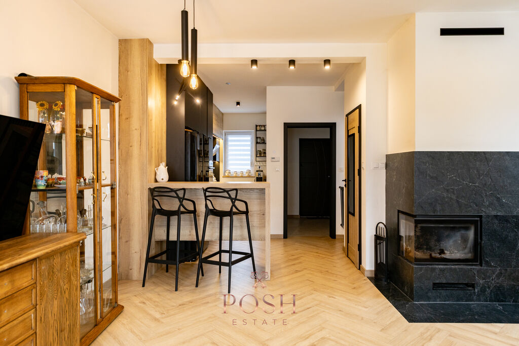 • kuchni z wyspą otwartej na salon z kominkiem